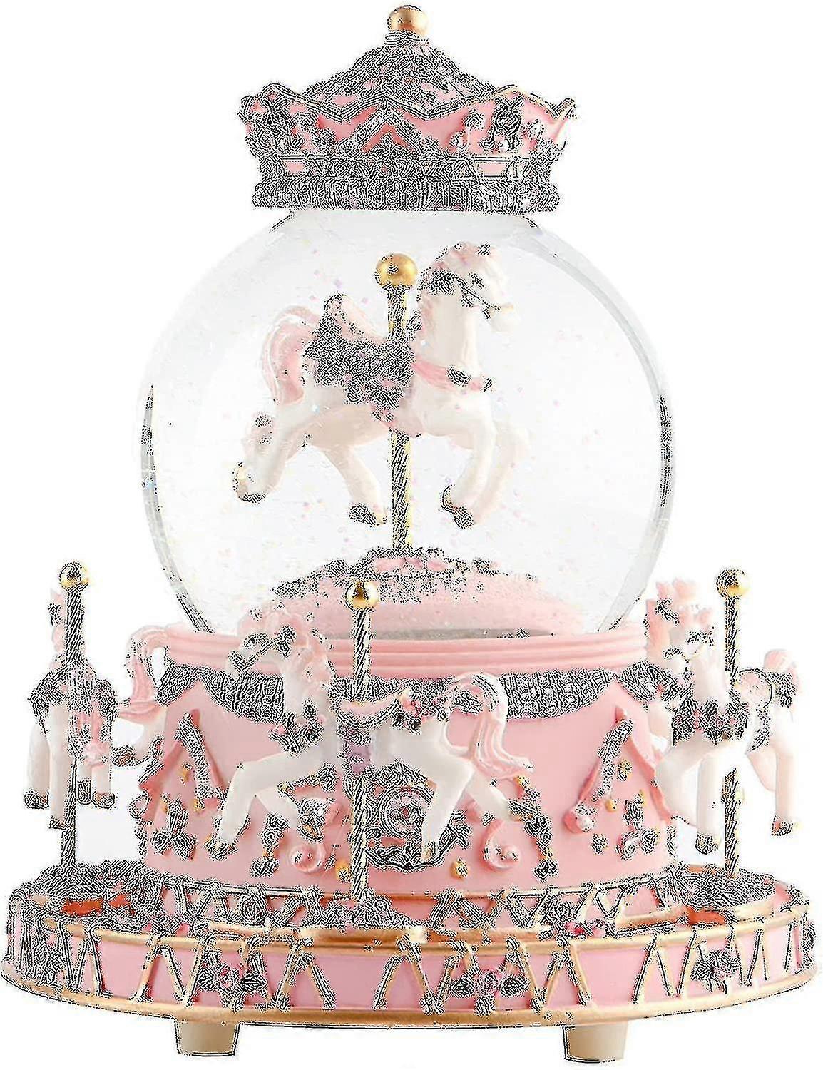 Carousel Snow Globe5 Horses outside rotate 360 degrees,Horse inside rotate with snow,colorful light and castle in the sky.Way to Enjoy:Turn the spring tightly,release and carousal snow globe will be playing, Turn on the switch,color will change from red to purple to white.music plays horse rotate.Exquisite Workmanship:Beautiful design,high-grade resin,gold plating,gorgeous hand carved top cover,wind up to drive in the nice music make the music box exquisite beyond any expectations you have.Wonderful Gift: Perfect for decorating your home,bedroom,shop and party.Great christmas,birthday, Valentine"s Day gift for lovers,children and girls.Material: made of environmental high-grade resin. About Shipping: All items will be shipped within 3 business days after the payment is received. Most times you will receive them within 8-12 days then. The specific delivery time is depend on circumstances. Any questions, please feel free to contact us During the shopping process, if you have any questions, please feel free to consult us, we will reply you within 92780 hours, wish you a happy shopping Thanks for your cooperation and we'll make you feel satisfied.