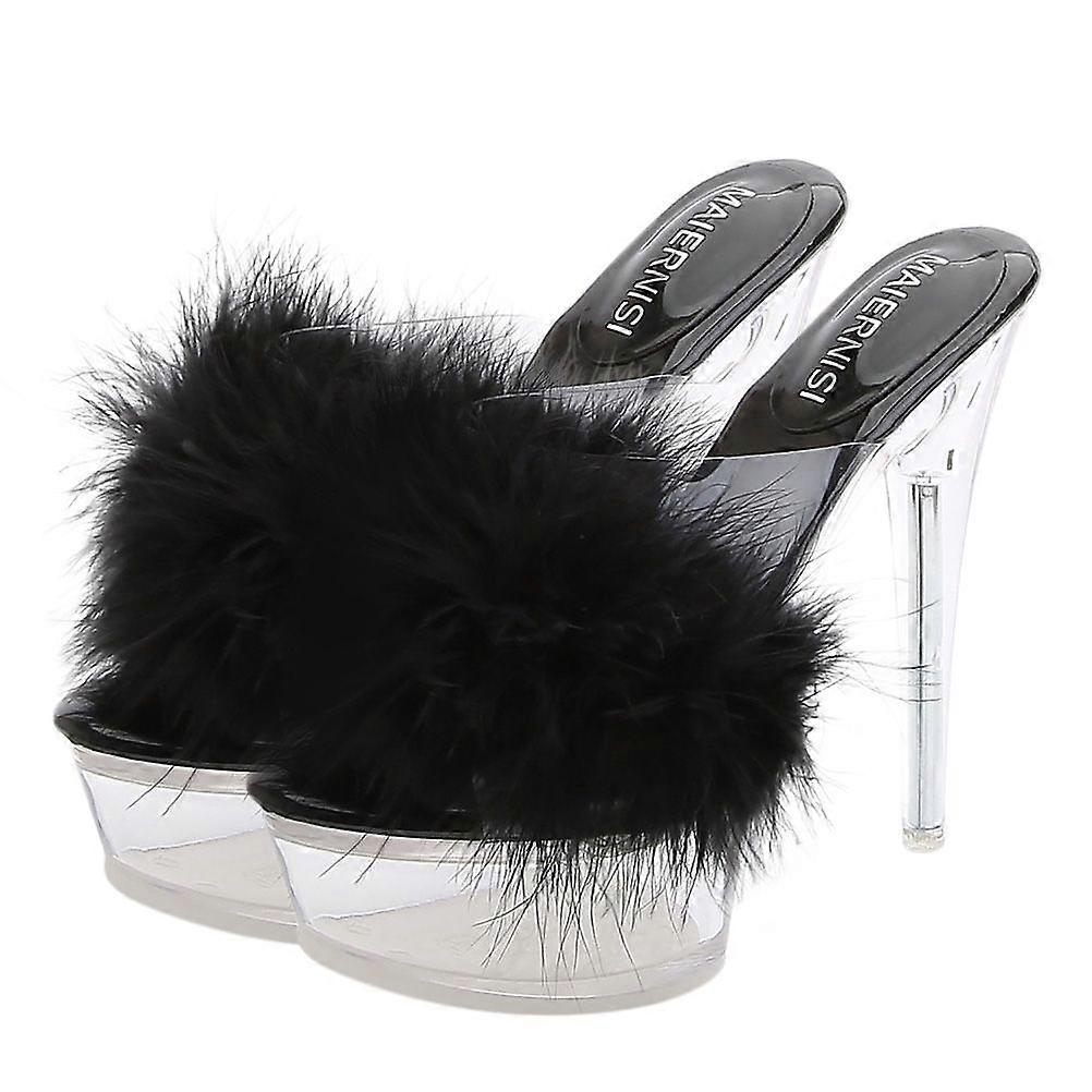 1 Pair Fashion High-heeled Slippers Transparent Crystal Thin Heels Fluffy Sandals