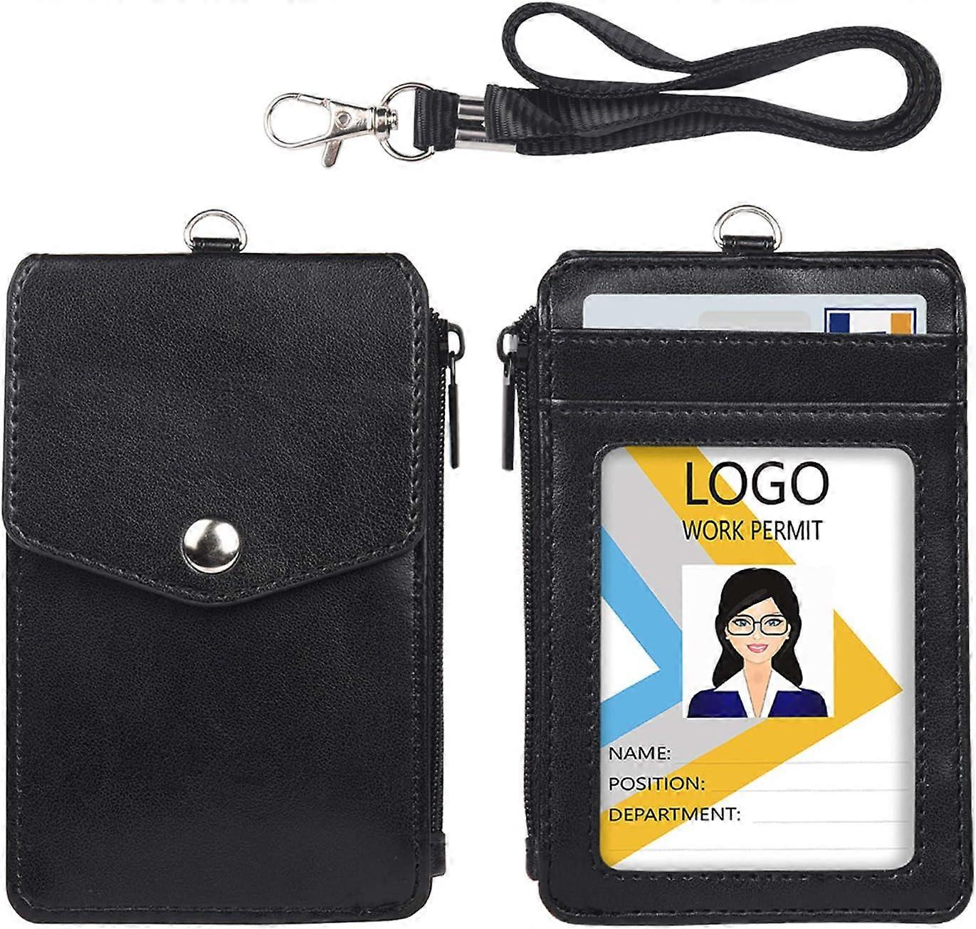1 Piece Leather Badge Holder with Zipper Pocket, Premium Leather ID Holder with Nylon Lanyard (Black)