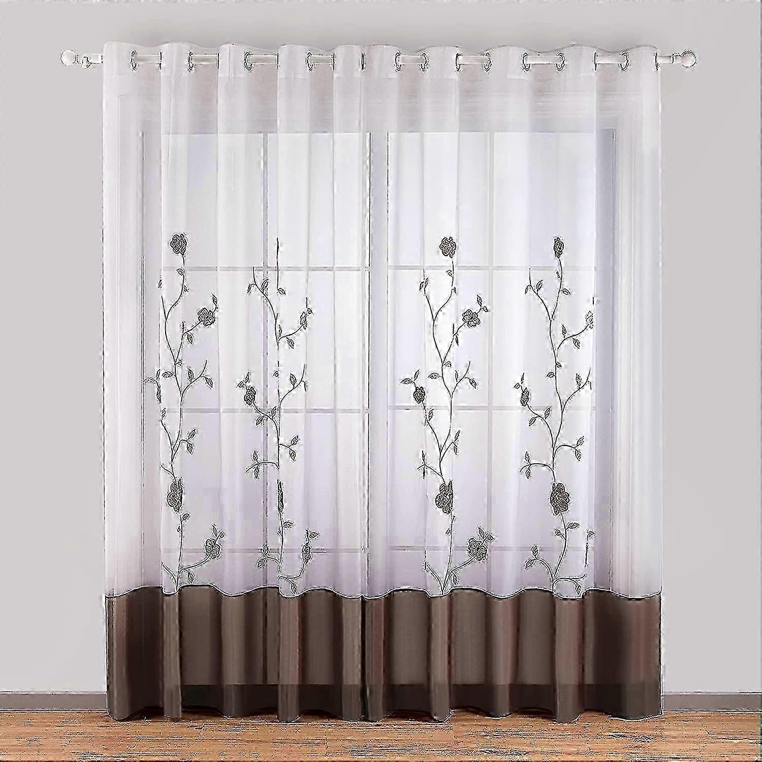 1 Piece Floral Embroidery Sheer Eyelet Curtains for Bedroom Kitchen Living Room, 140cmx245cm, Brown