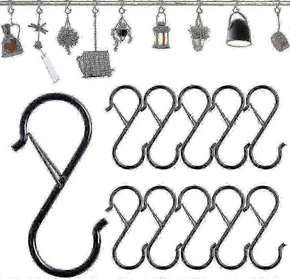 10 Pack S Hooks For Hanging Black S Hooks Heavy Duty Metal Hooks With SafetyPackage Include: 10 pcs S hooks sturdy and durable, with anti-rust surface and safety buckle design, suitable for indoor or outdoor applications. . material: Our S hook is made of heavy-duty steel with rust proof coating. Smooth finish will avoid any scratch. It can bear a maximum weight of 40Ib and offer sturdy support for a long time. .The hanging hook length is 9cm in length. The diameter of openings is 3cm. Please measure the diameter of the suspension rod before purchase. .Safety buckle design: The hanging hooks with practical elastic buckle design are windproof, to prevent hanging objects from falling. It can be used in various environments without any sliding out worry. .Wide application: The multi-purpose hanger hook is suitable for daily use in kitchen, closet, bathroom, outdoors, offices and workplaces. It can be used for safe hanging and organizing items: cups, mugs, pots, pans, plants, wires, wind chimes, feeders, birdhouses, lanterns, ropes, chains, candle holders, party dcor, holiday lights, utensils, tools and more. .Easy to use: S shaped, no need to stick or use screws. Easy to use and remove, no track left. Both sides can be used for hanging items, very practical for meeting your different needs. These durable s hooks can help you make everything convenient and neat. . Note: Due to the light and screen setting difference, the item's color may be slightly different from the pictures. Please allow slight dimension difference due to different manual measurement.