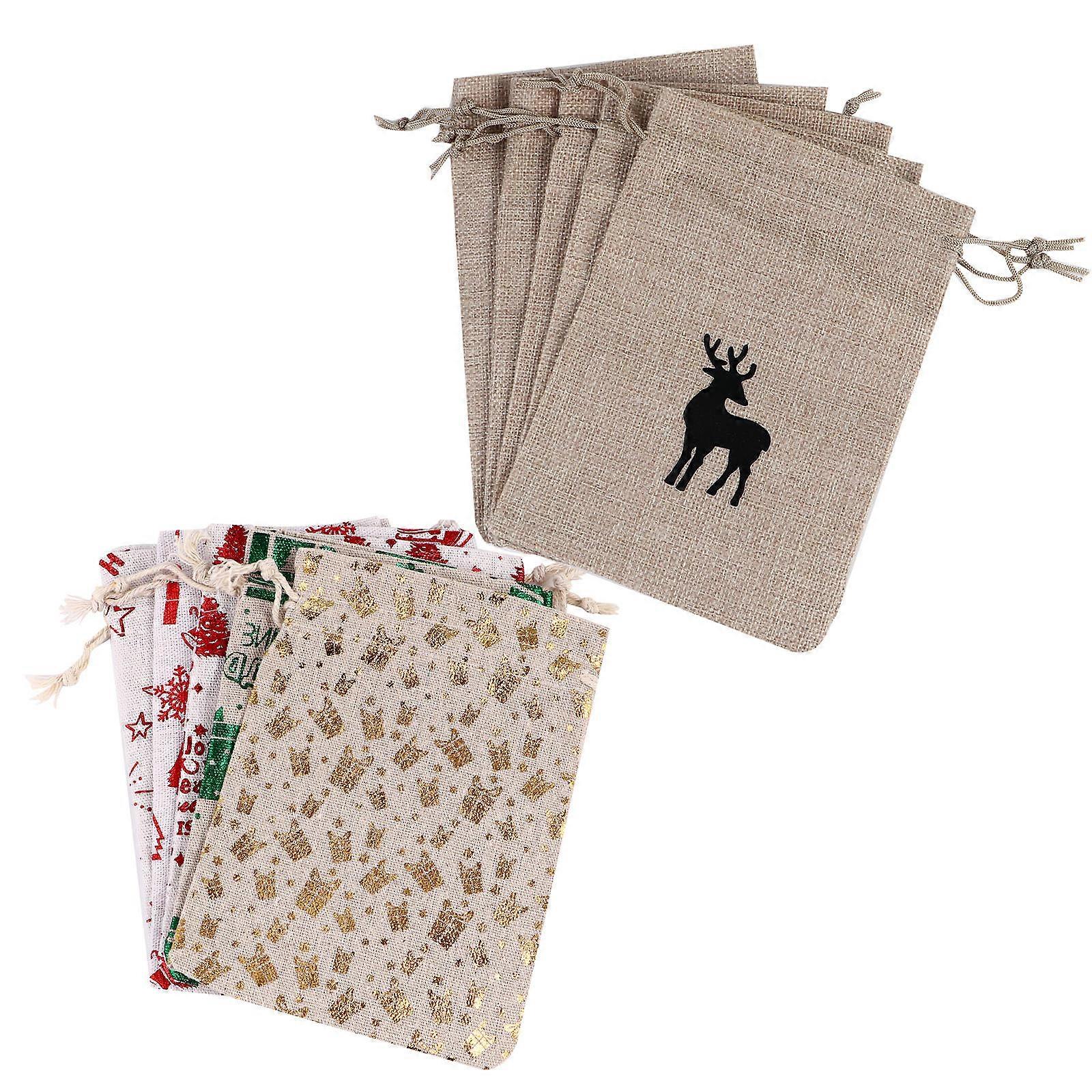 10pcs Christmas Burlap Gift Bags Drawstring Candy Pouches Holiday Treat Goody Bags Xmas Party Favors Assorted Rustic Style Packaging