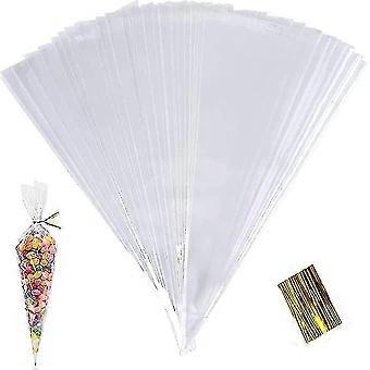 100 قطعة أكياس مخروطية واضحة ، أكياس علاج السيلوفان للحلويات ، أكياس مثلث حلوى بلاستيكية 25x13 سم مع روابط ملتوية للطعام