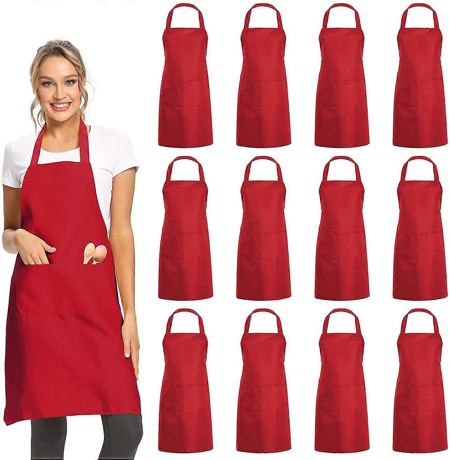 12 Pack Plain Bib Aprons With 2 Pockets - Red Unisex Commercial Apron Bulk For Kitchen Cooking BBQ