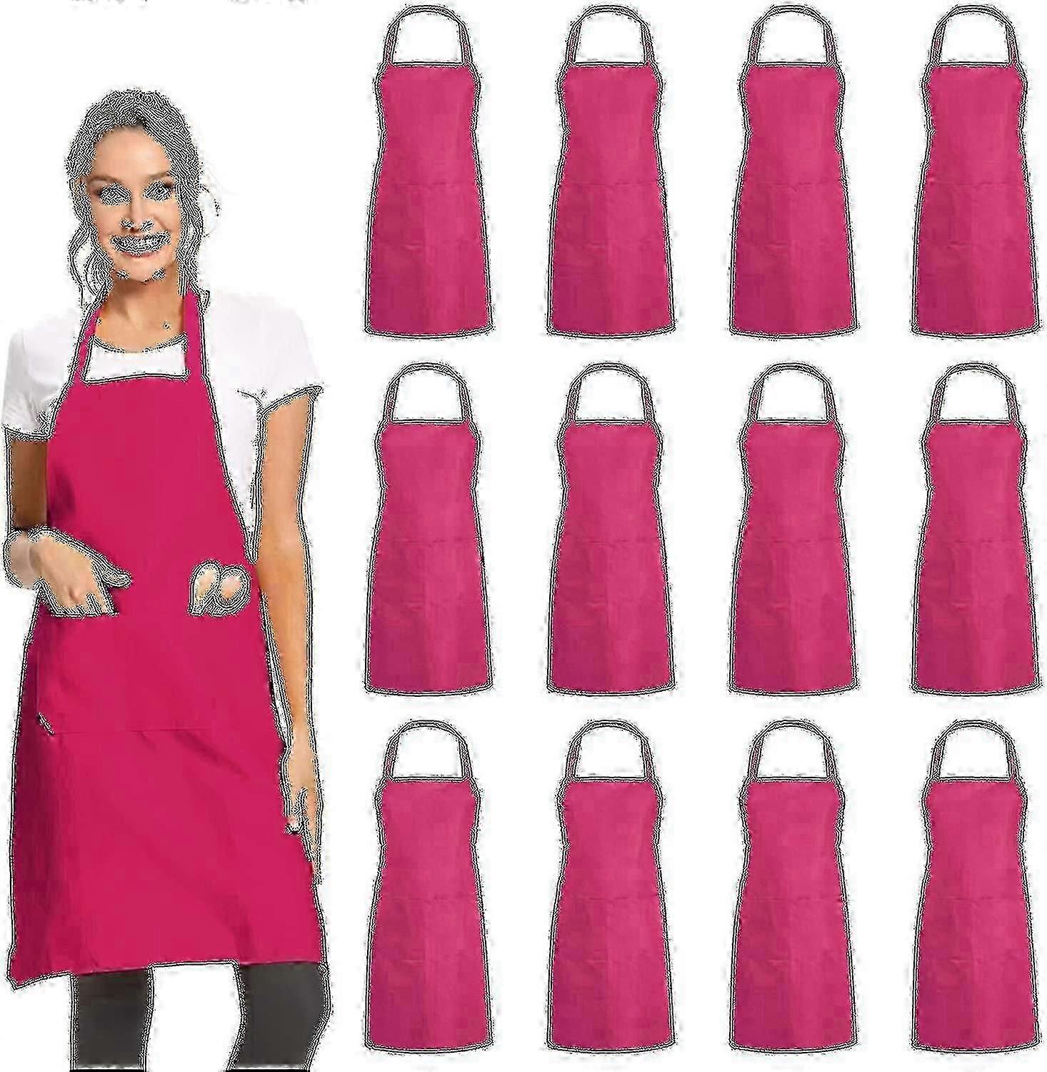 12 Pack Plain Bib Aprons With 2 Pockets - Pink Unisex Commercial Apron Bulk For Kitchen Cooking