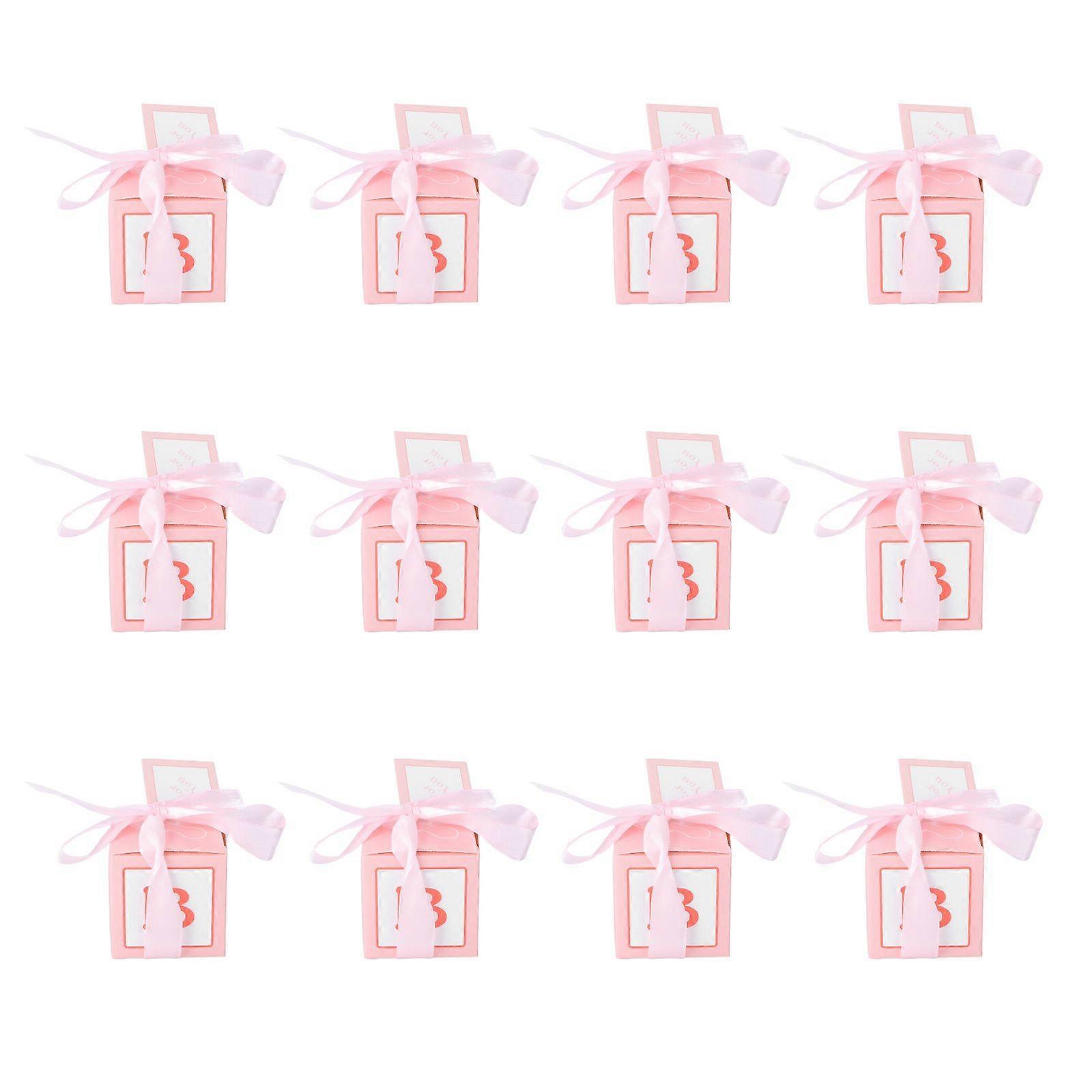12pcs Wedding Baby Shower Candy Boxes Printed Boxes with Stitched Ribbon and Cards Decent Chocolate Treat Boxes(Pink)