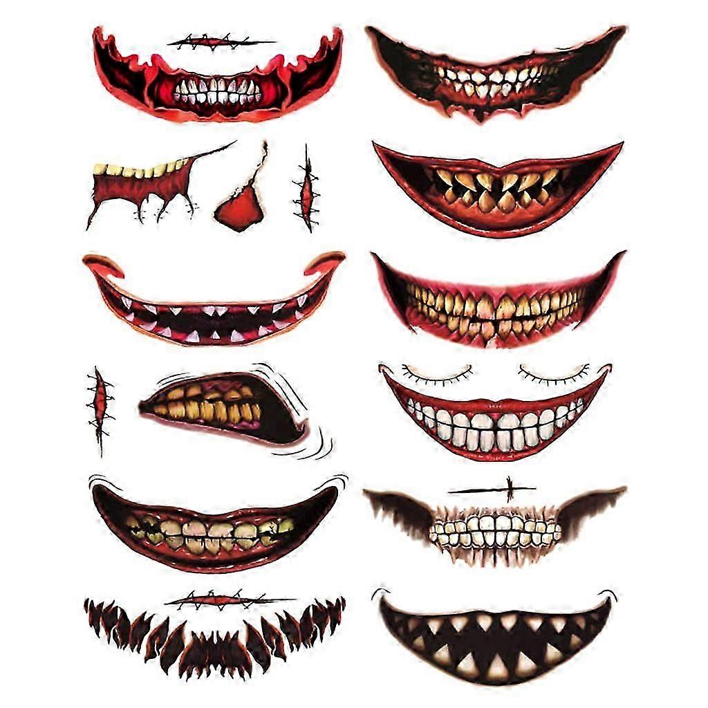 12pcs Halloween Temporary Tattoos Clown Scary Mouth Tattoo Sticker for Party Props Horror Cosplay Costume Makeup Props