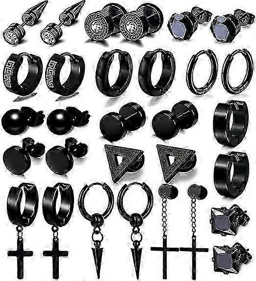15 Pairs Unisex Earrings - Black Steel Stud & Dangle Hoop Collection