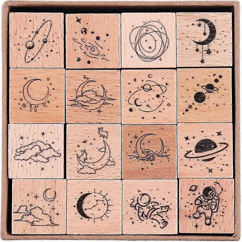 16 Pieces Vintage Wooden Rubber Stamps, Universe & Galaxy Decorative Rubber Stamp Set