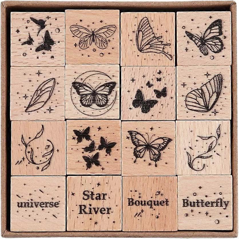 16 Pieces Vintage Wooden Rubber Stamps, Butterfly & Wings Decorative Rubber Stamp Set