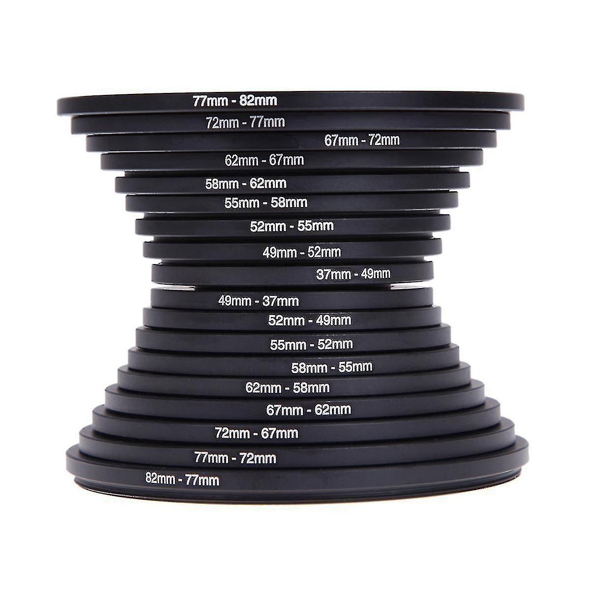 The ring adapter screws onto the front of any lens and converts the lens' thread size to that of any other accessories such as filters, hoods, flashes, and lens converters. Made of high quality aviation aluminum alloy. strong and light. Specifically designed for your camera for a snug fit. No wiggling or -threading. The first number is always the lens thread size and the second number is the filter size of the accessory. If the first number is larger, it is a step-down ring. If the first number is lower, it's an upgrade. Colour:black Material:Aviation aluminum alloy Package Contents: 1 x 37mm-49mm Step-up Ring 1 x 49mm-52mm Step-up Ring 1 x 52mm-55mm Step-up Ring 1 x 55mm-58mm Step-up Ring 1 x 58mm-62mm Step-up Ring 1 x 62mm-67mm Step-up Ring 1 x 67mm-72mm Step-up Ring 1 x 72mm-77mm Step-up Ring 1 x 77mm-82mm Step-up Ring 1 x 49mm-37mm Step-down Ring 1 x 52mm-49mm Step-down Ring 1 x 55mm-52mm Step-down Ring 1 x 58mm-55mm Step-down Ring 1 x 62mm-58mm Step-down Ring 1 x 67mm-62mm Step-down Ring 1 x 72mm-67mm Step-down Ring 1 x 77mm-72mm Step-down Ring 1 x 82mm-77mm Step-down Ring Only the above package content, other products are not included. Note: Light reflection and different displays may cause the color of the item in the picture a little different from the real thing. The measurement allowed error is +/- 1-3cm.