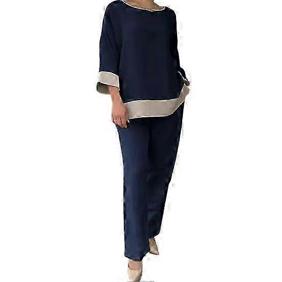 2 Pcs/Set Women Top Pants Suit Round Neck Three Quarter Sleeves Contrast Color T-shirt