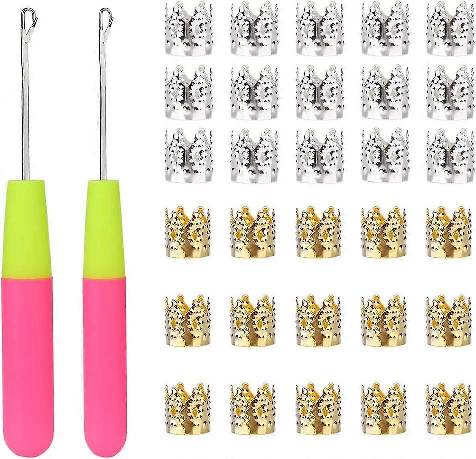 2 PCS Latch Hook Crochet Needle + 30 PCS Dreadlocks Hair Ring Decoration Braiding Hair Silver Gold Metal