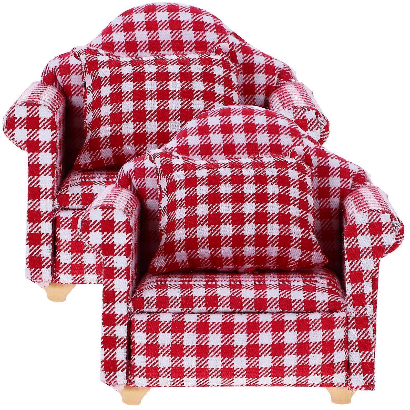 2pcs Doll House Mini Wood Couch Plaid Doll House Single Sofa Doll House Wooden Sofa