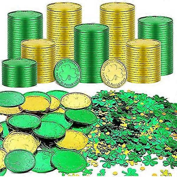 200 pcs St. Patrick's Day plastic shamrock coins, gold and green lucky coins with clover and leprechaun confetti for Irish party