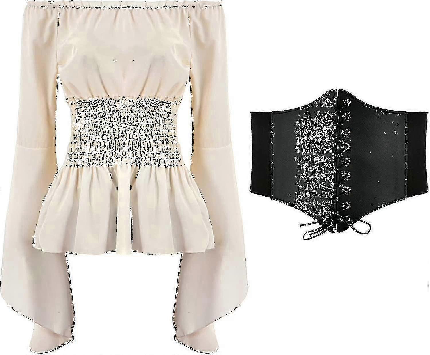 2023 Womens Renaissance Blouse Tops Corset Waist Belt Medieval Victorian Off Shoulder Long Sleeve Shirt Pirate Cosplay Costumes Fast-zong