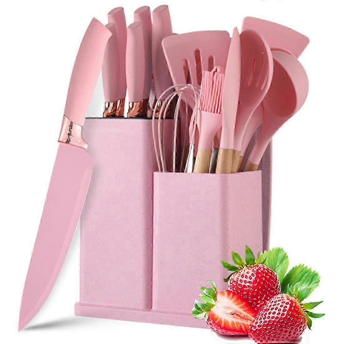 2025 Cherry Pink 19 Piece Kitchen Utensils and Knife Set with Block, Including 9 Silicone Utensils
