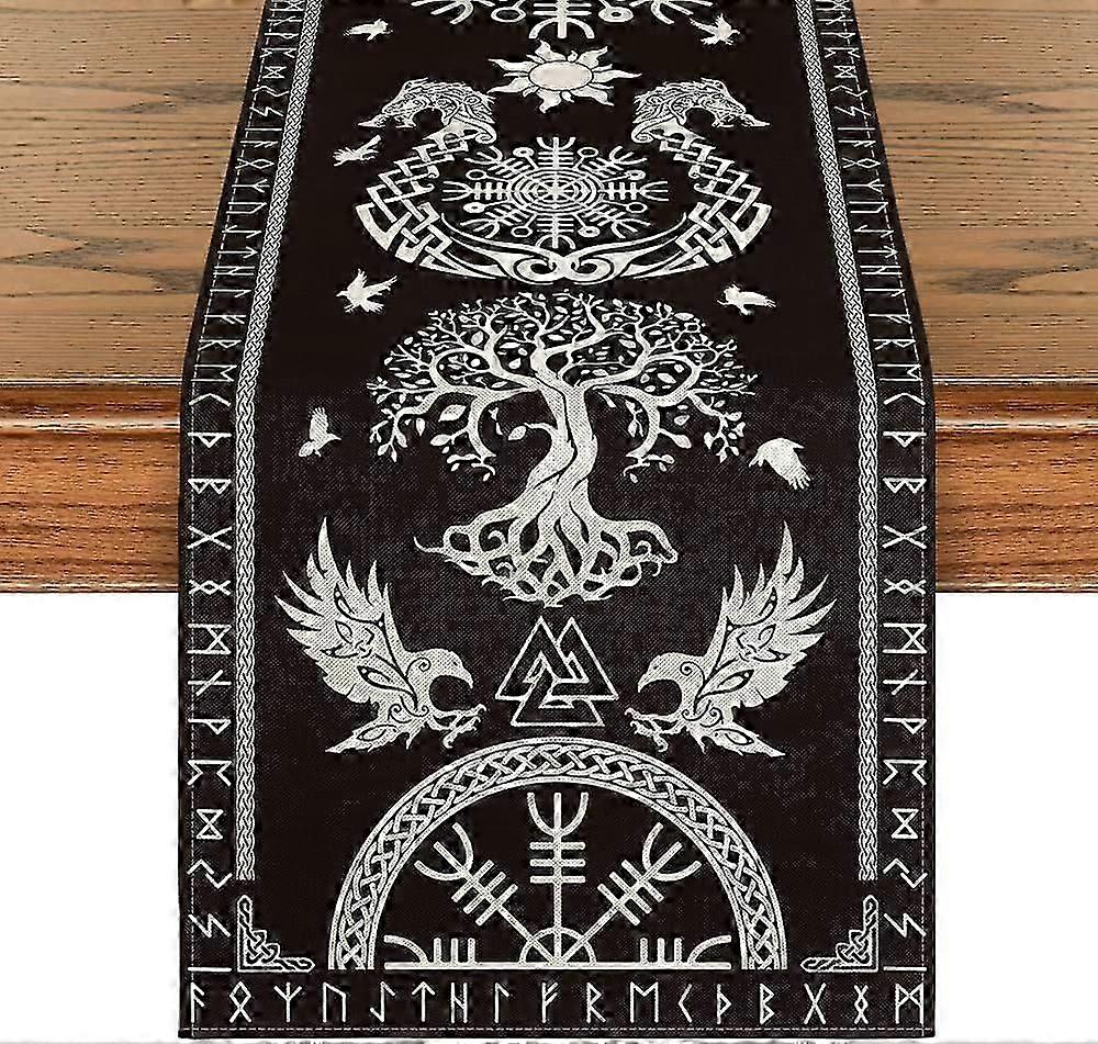 2025 Black Viking Tree of Life Raven Helmet of Awe Table Runner, Seasonal