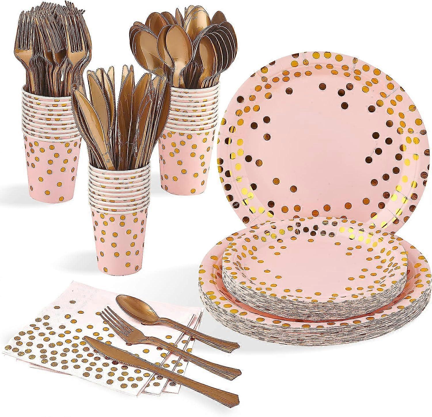 210 Piece Golden Dot Disposable Party Dinnerware Set 30 Guest -Black Paper Plates Napkins Cups,Gold Plastic Forks Knives Spoons,FOCUSLINE Black and Go