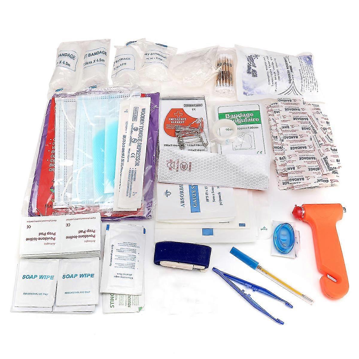 1 x Bag1 x Buckle Tourniquet4 x Sterile Gauze Pads(5cm*5cm)2 x Sterile Gauze Pads(7.5cm*7.5cm)50 x Band-aids10 x Round Band-aids5 x H Shape Band-aids5 x Closure Band-aids10 x Small Band-aids2 x Soap Wipes2 x Antispetic Claening Wipes1 x Wound Dressing(6cm*7cm)1 x Wound Dressing(6cm*10cm)2 x Confirming Bandage(5cm*4.5cm)2 x Confirming Bandage(7.5cm*4.5cm)1 x Adhesive Tape2 x Triangular Bandage10 x Safety Pins1 x Mercury Thermometer44 x Povidone-Iodine Prep Pads4 x Sting Relief Prep Pads2 x Cleaning Wipe Alcohol Free1 x Tweezers1 x Ice Pack2 x Fever Cooling Patch2 x Wooden Tongue Depressor55 x Cotton Swabs1 x PVC Glove1 x Emergency Blanket2 x Mask1 x Raincoat3 x Article Reflection Warning1 x 2 in 1 Safety Hammer1 x Cardio Puimonary ResuscitationBag Color: RedSize: 260*80*180mm(L*W*H)Quantity: 233 PCSFeatures:- Small size and easy to carry.- First aid dedicated, fully equipped.- A good choice for emergency situation.- Essential items for going out or at home.- Multifunctional, practical and convenient.- With quality hardware zipper, easy to open and close.- Made of high quality material, waterproof, high wear resistance.- Can be used for outdoor travel, home life, business travel, on-board.Package Included:1 x Bag1 x Buckle Tourniquet4 x Sterile Gauze Pads(5cm*5cm)2 x Sterile Gauze Pads(7.5cm*7.5cm)50 x Band-aids10 x Round Band-aids5 x H Shape Band-aids5 x Closure Band-aids10 x Small Band-aids2 x Soap Wipes2 x Antispetic Claening Wipes1 x Wound Dressing(6cm*7cm)1 x Wound Dressing(6cm*10cm)2 x Confirming Bandage(5cm*4.5cm)2 x Confirming Bandage(7.5cm*4.5cm)1 x Adhesive Tape2 x Triangular Bandage10 x Safety Pins1 x Mercury Thermometer44 x Povidone-Iodine Prep Pads4 x Sting Relief Prep Pads2 x Cleaning Wipe Alcohol Free1 x Tweezers1 x Ice Pack2 x Fever Cooling Patch2 x Wooden Tongue Depressor55 x Cotton Swabs1 x PVC Glove1 x Emergency Blanket2 x Mask1 x Raincoat3 x Article Reflection Warning1 x 2 in 1 Safety Hammer1 x Cardio Puimonary Resuscitation