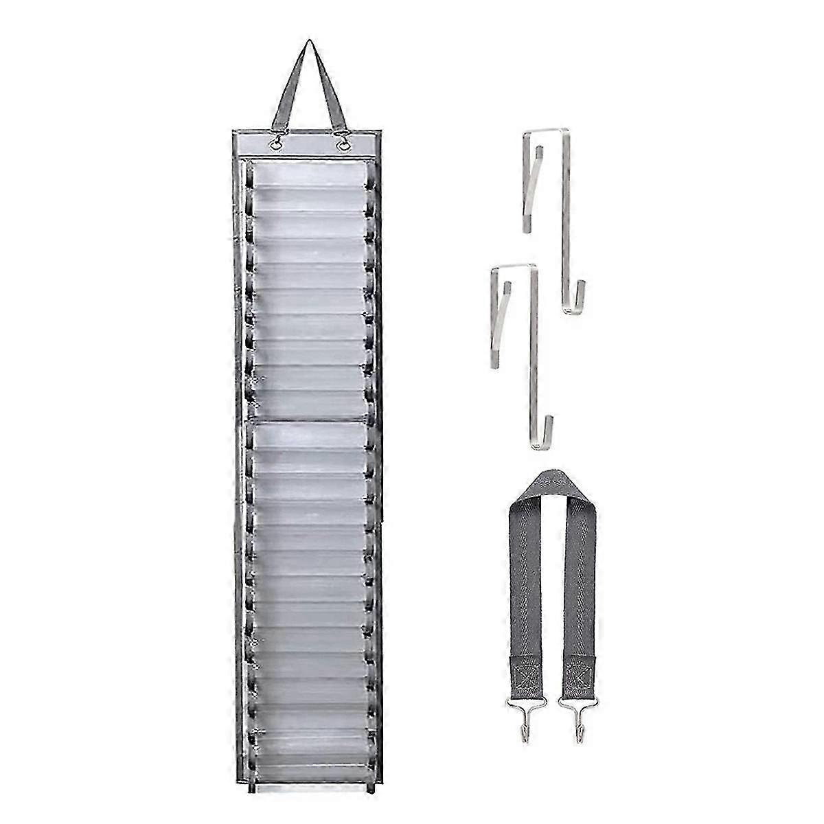 [Vinyl Storage Oranizer] It is a good solution to keep the craft vinyl rolls organized and the craft room will be clean and tidy. [Premiun Material] The vinyl storage holder is made of polyester fabric and PVC material. It is and hard to damage. With the transparent design, it is easier to see what and where you have in stock. [Large Capacity] The vinyl holder comes with 24 slots, Enough to hold vinyl rolls and make sure they 't fall and it is easy to access when needed. [Space Saving] Come with a strap and you can hang it on the closet, wall or on a hook. The extra 2 back door clips help the organizer bag hang over the door. [Widely Used] The vinyl roll rack not only for vinyl roll storage, it is also perfect for storage,ribbon, gift wrap organizer and wrapping paper storage,etc. Name:Storage Pouch Colour:Light Grey Material:Oxford cloth+PVC Package Contents: 1 x Storage Pouch 1 x Webbing Hook 2 x Spring Metal Hooks Only the above package content, other products are not included. Note: Light reflection and different displays may cause the color of the item in the picture a little different from the real thing. The measurement allowed error is +/- 1-3cm.