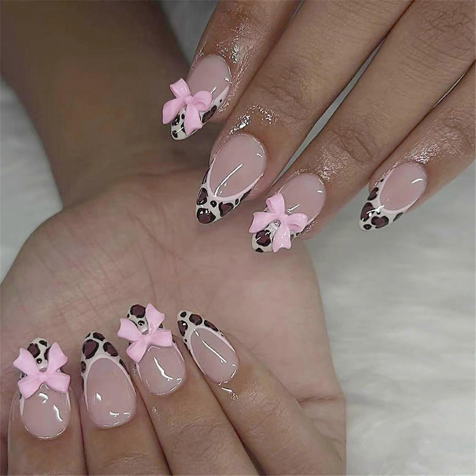 24pcs French Manicure False Nail Glossy Leopard Pattern Bows Design Artificial Nail Easy Application ABS Material Multicolor