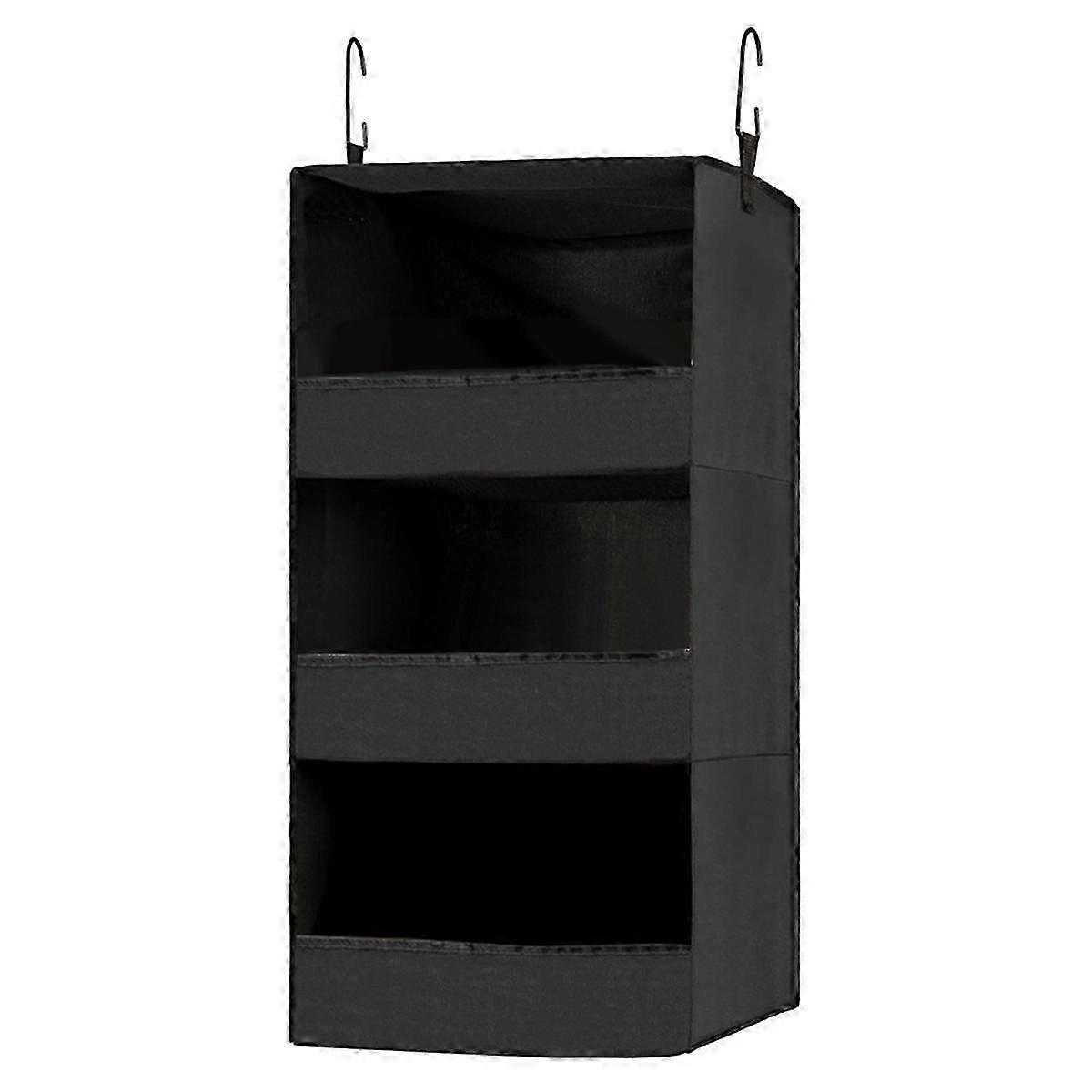 The hanging organizer measures 24inch H x 11.8inch W x 11.8inch D, the hook is 3.9inch H. 3-shelf organizer works great in closets, shelves, wardrobes, RVs, trailers for storing towels, T-shirts, socks, accessories, bibs, diapers, baby wipes, etc. The little strip the front of each shelf prevents items from slipping off accidentally, especially some small items. Each layer has a removable and durable board to enhance the bearing capacity. The organizer is machine washable after removing all the boards and hooks. Made of , tear-resistant and washable material, no assembly required. Collapses flat for space-saving when not in use or take it to travel. Colour:Black Material:Polyester Package Contents: 1 * Hanging Organizer Only the above package content, other products are not included. Note: Light reflection and different displays may cause the color of the item in the picture a little different from the real thing. The measurement allowed error is +/- 1-3cm.