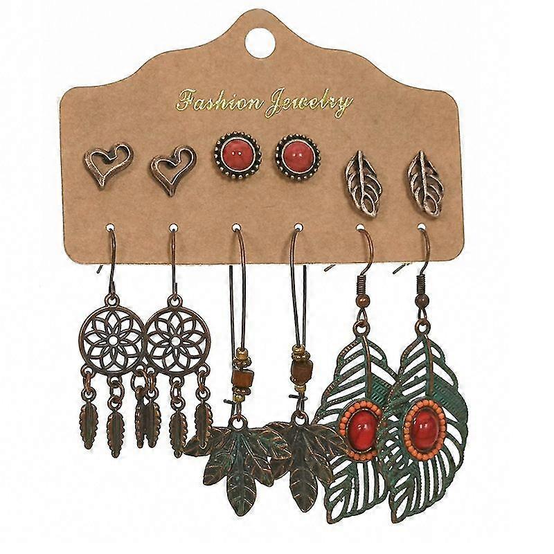 3 Pairs Fashion Hollow Drop Dangle Earrings Set for Women Girls Bohemian National Style Eardrop with Bronze Waterdrop Leaf Feather Shaped Vintage Jewe
