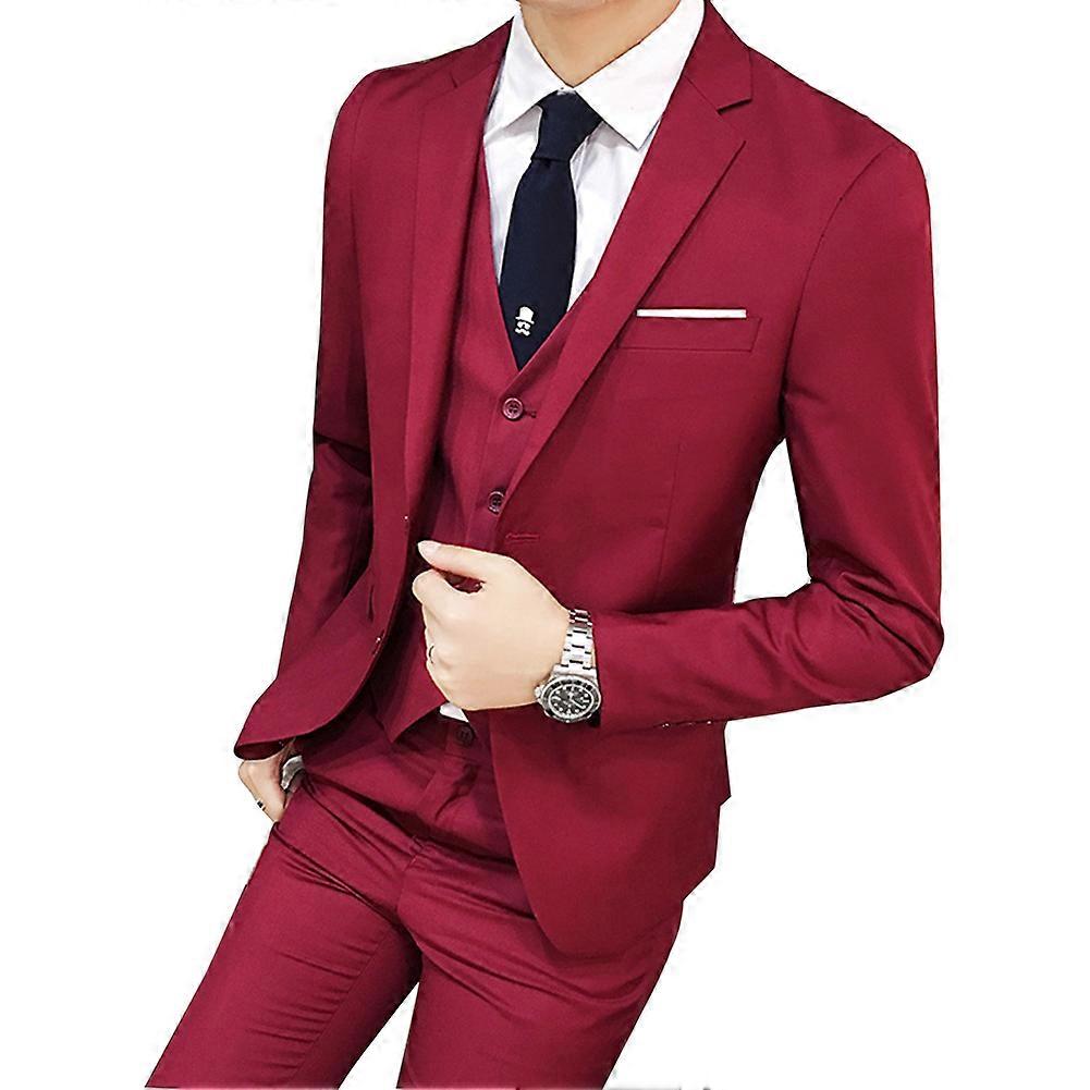 3pcs Men Fashion Solid Color Suit Formal Wear Business Jacket Pants Vest Set (Red S)