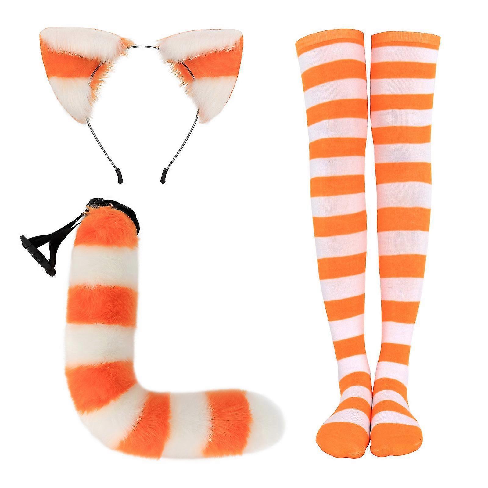 3 Pcs Halloween Party Props Set, Adjustable Simulation Fox Tail, Plush Fox Ears Hairband, Striped Stockings