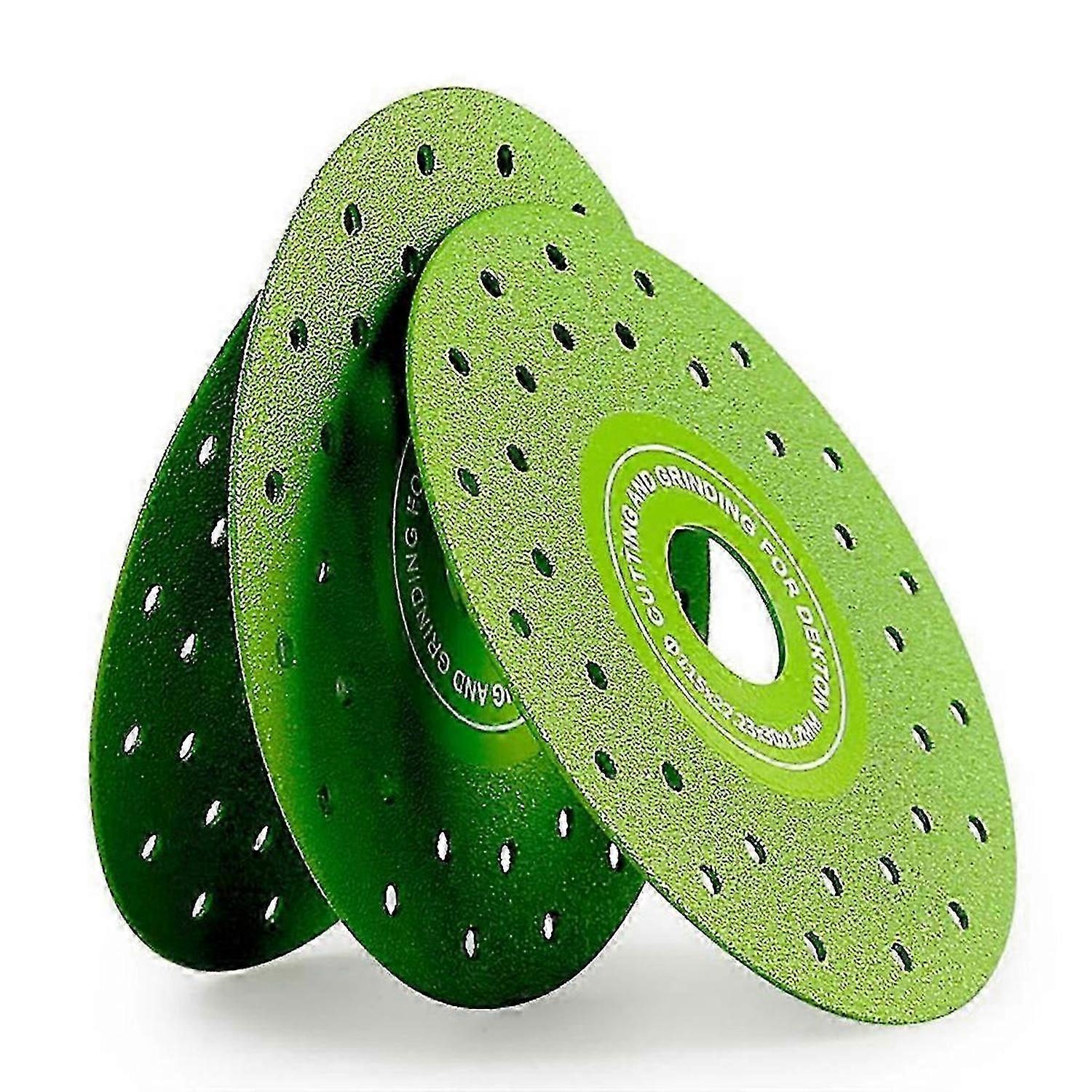 Versatile Application: This set includes three 5inch vacuum brazed, ultra-thin, multi-pore flat abrasive discs, expertly designed for precision grinding and polishing of porcelain, glass, ceramic tiles, , and marble surfaces.<br>Ultra-Thin Precision: Each disc measures a mere 0.05inch in thickness, offering unparalleled precision in grinding and polishing tasks. The thin profile ensures minimal material removal and maximum control during use.<br>Efficient Multi-Pore Design: Featuring a unique multi-pore , these discs facilitate efficient material removal and achieve smooth finishes, enhancing the overall efficiency and quality of your work on hard surfaces.<br>and Reliable: Crafted using advanced vacuum brazing technology, these diamond saw blades are built to last. They resist wear and tear even under heavy usage, making them a reliable choice for both professional and DIY projects.<br>Professional Grade Tools: Ideal for both professional tradespeople and DIY enthusiasts, these discs provide top-tier performance in handling challenging materials and complex tasks, ensuring high-quality results every time.<br>Colour:Green<br>Material:Emery<br>Size: about 115x30x1.2mm<br>Package Contents:<br>3 x diamond cutting disc<br>Only the above package content, other products are not included.<br>Note: Light reflection and different displays may cause the color of the item in the picture a little different from the real thing. The measurement allowed error is +/- 1-3cm.