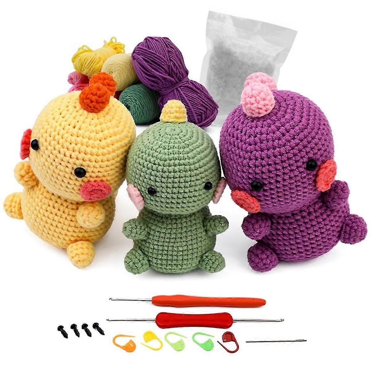 3Pcs DIY Crochet Dinosaur Kit with Hand Knitting Yarn Needles Plush Doll Easy(Yellow,Green,Purple)
