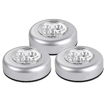 Material: durable hard ABS.3 pcs set.Easy to install: With built-in self-adhesive sticker on the backside Enjoy bright white light wherever you need it fast Each LED light adopts 3 LEDs as light source to give off super bright white light for illumination. Easy to use, turn on/off light only to touch the top of the light. Battery powered, no wires required: each LED light is powered by 3 * 1.5V AAA batteries (not included).