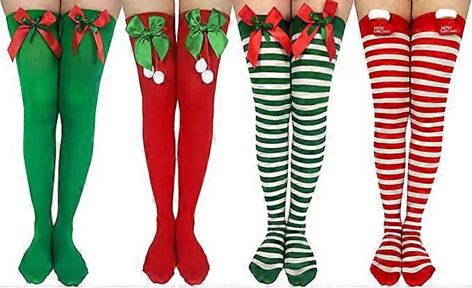 4 Pairs Women Christmas Striped High Knee Socks Ladies Tights Thigh Holds-up Stretchy Stockings