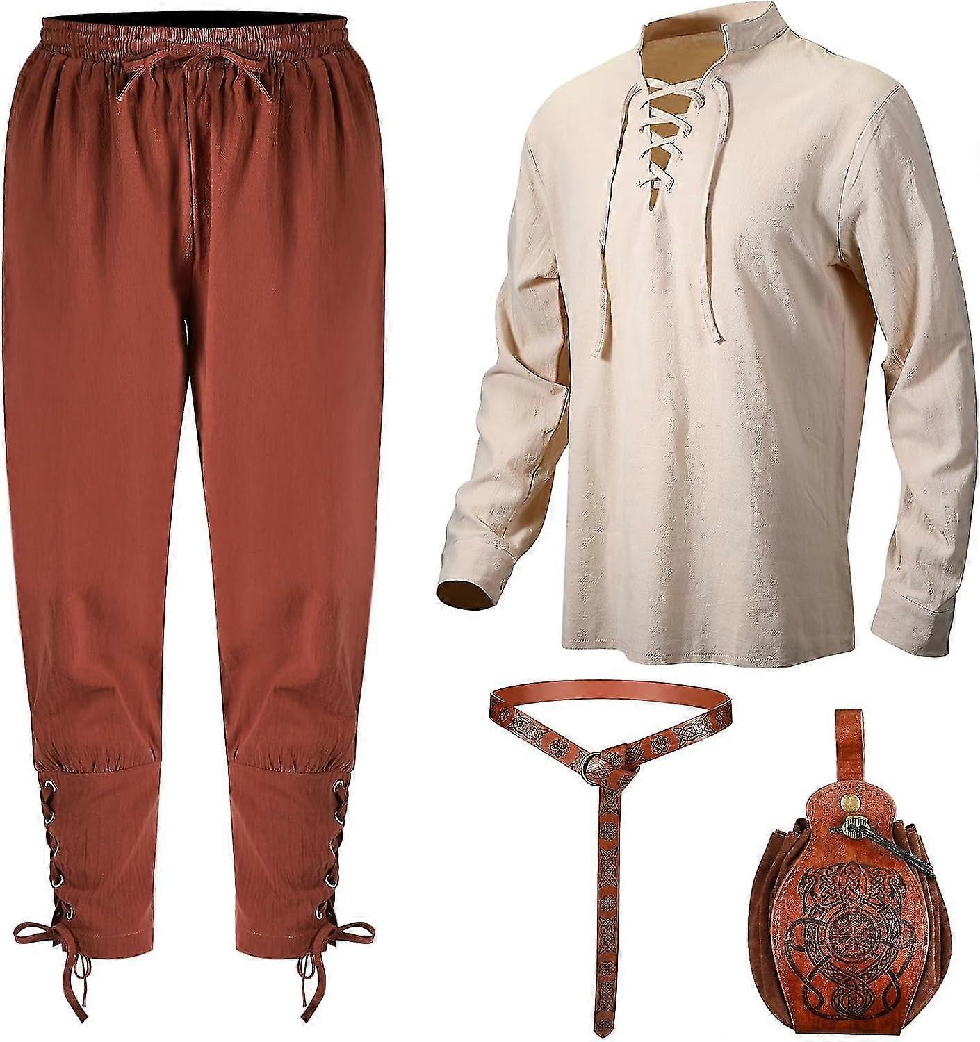4 Pcs Halloween Medieval Viking Costume Include Lace Up Long Sleeve Shirts Cuff Renaissance Pants Leather Belt Pouch