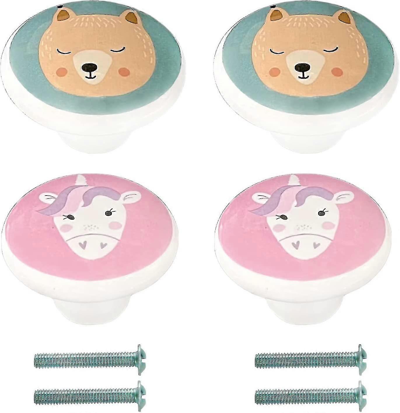 4pcs Kids Ceramic Cabinet Knobs Bear And Unicorn Drawer Pull With Screws, Cute Round Door Knobs Anim