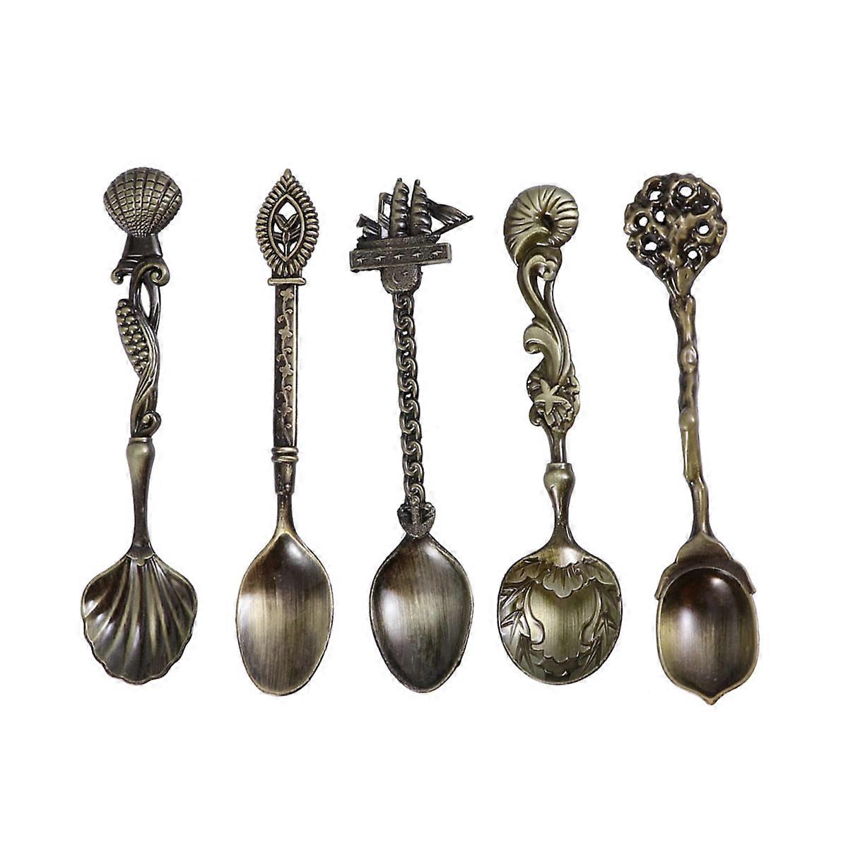5 Pcs Alloy Retro Coffee Spoon Set Carved Design for Stirring Beverages and Coffee, Coffee Color
