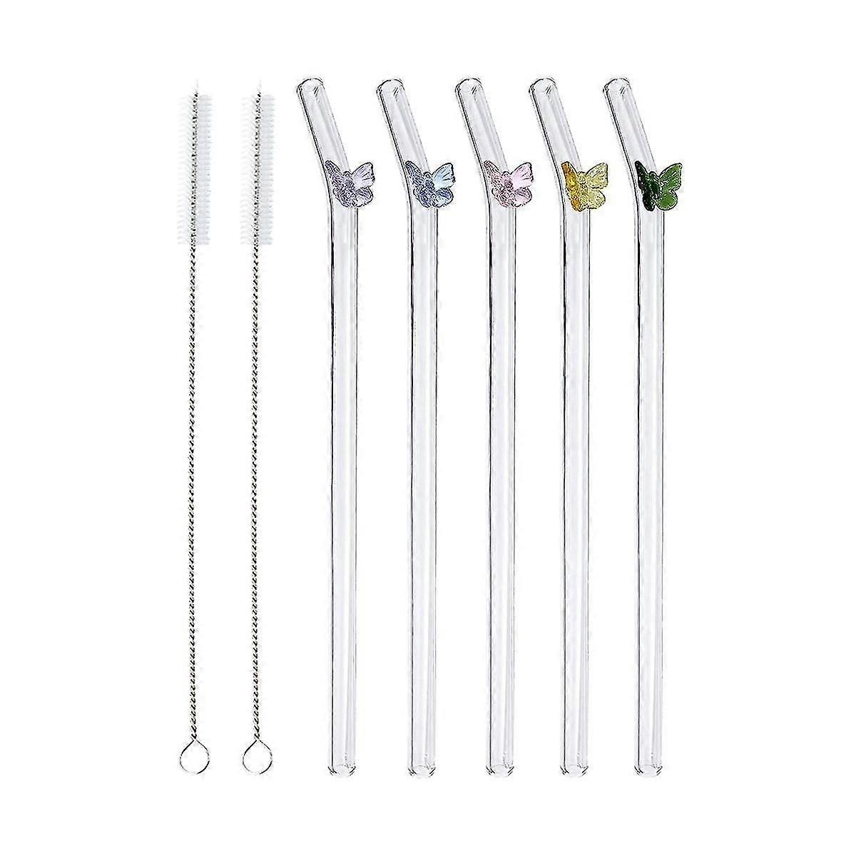 5 Pcs Colorful Butterfly Glass Straws - Reusable, Shatter Resistant, Bent Design, Clear Drinking Straws