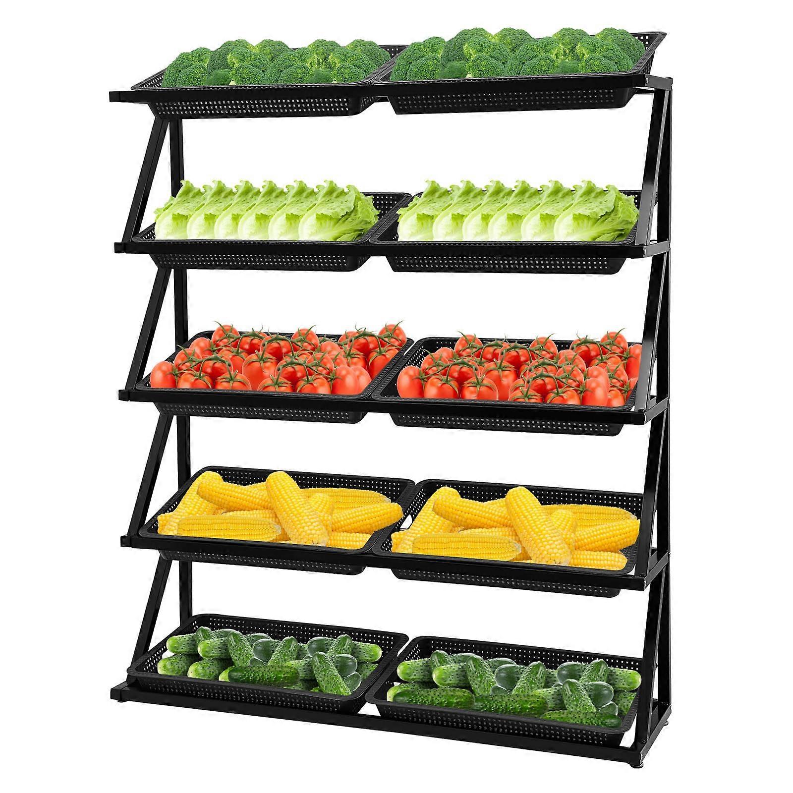5 Tier Retail Display Rack with Open Baskets, 220lbs Load Capacity Metal Market Shelf for Fruits and Vegetables, Black