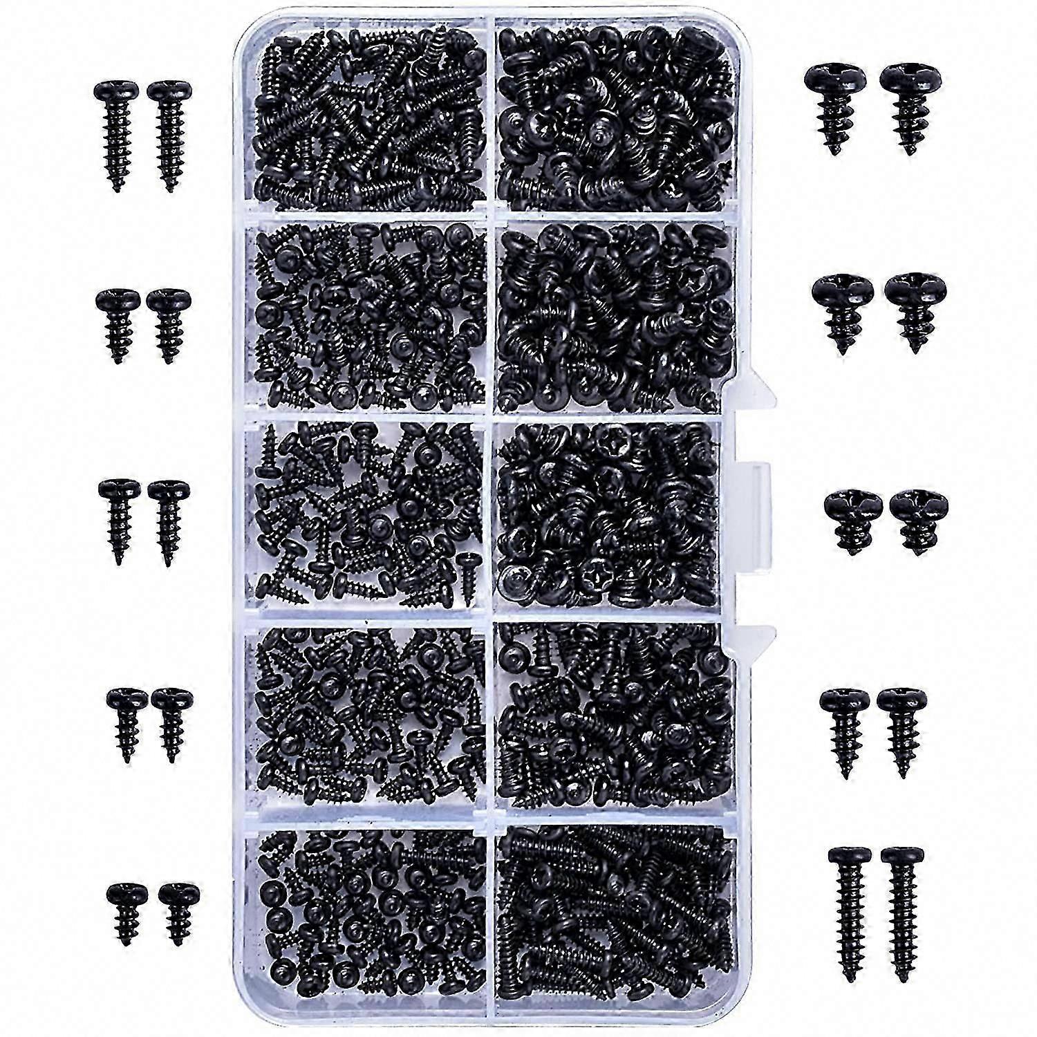 10 Sizes Self-Tapping ScrewsYou will receive 10 sizes of self-tapping screws. Their sizes are M2 x 4mm/5mm/6mm, M2.3 x 5mm/8mm/10mm, M2.6 x 6mm, M3 x 4mm/5mm/6mm, each size has 50 pieces. Enough to meet your daily needs.Premium Quality ScrewsThe series of self-tapping screws are made of carbon steel with high strength and black oxidation treatment. They have strong resistance to rust and corrosion even in humid environments.Deep Thread and Cross Head Self-drilling wood screw does not need to be used with the nut. The screws have been designed to produce a tight screw and hold well when unscrewed/rescrewed.Convenient to StoreThis 500pcs screw set is well packed and assorted in a plastic box , don't worry about damage or mess. It also comes with detailed sizing information. The box design is nice and easy to unscrew.Wide Application The round head screw set can be used for computers, phones, watches, glasses, electronic devices, electrical appliances, furniture , toys, automobiles or any other repair that requires small screws.