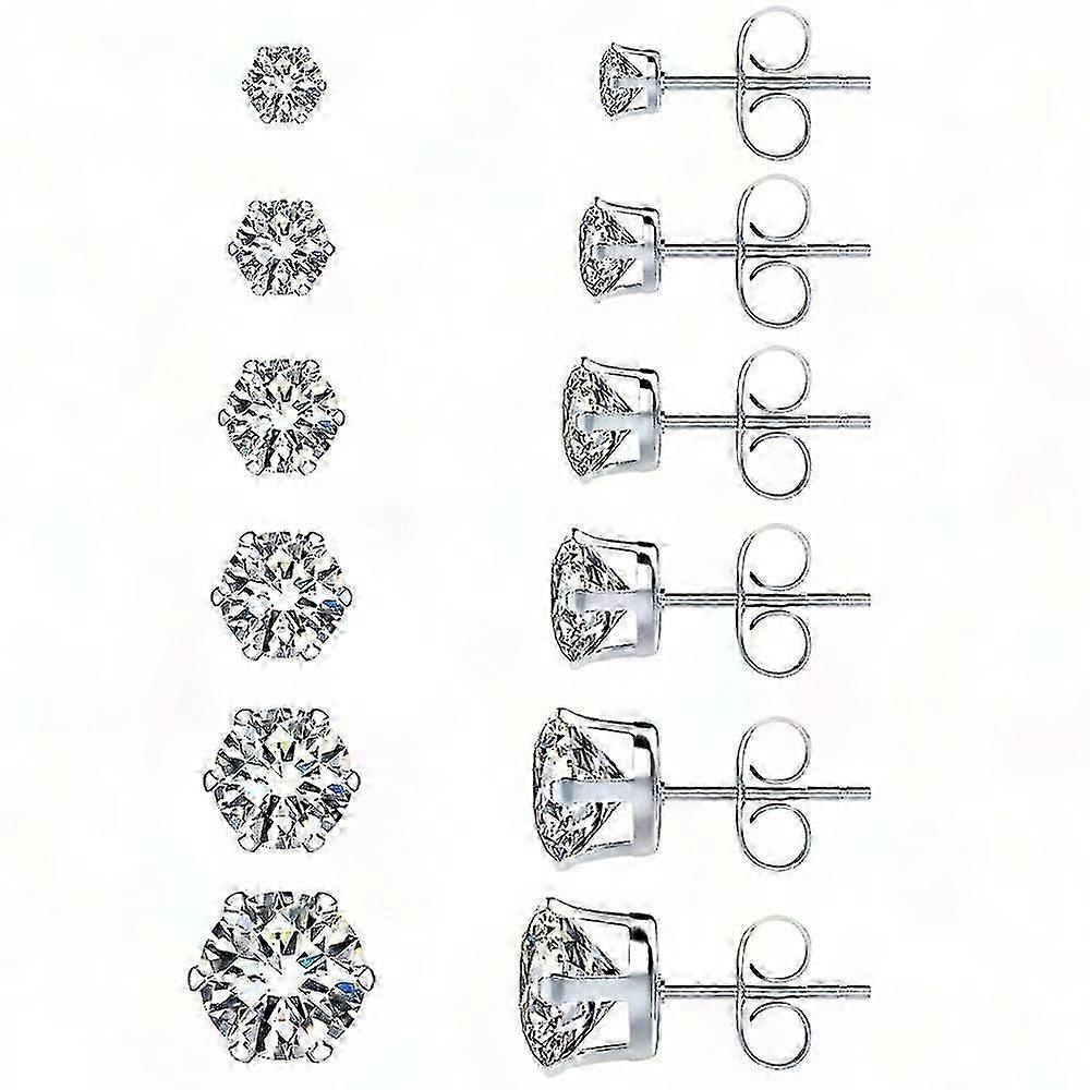6 Pairs of Hypoallergenic Stainless Steel Earrings - White Gold Plated Studs with Cubic Zirconia