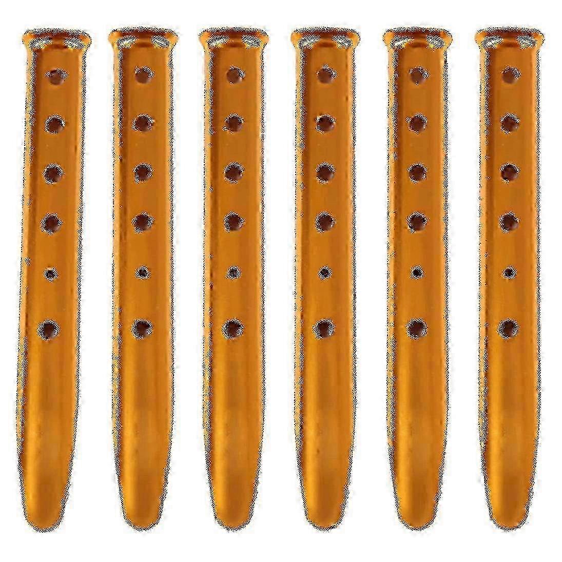 GRIP FIRMLY - the tent pegs can be used on beaches, soft land and snow, not suitable for any hard land or stone land. In the soft land, it is more firmly trapped and fixedLENGTHENING U-SHAPED DESIGN - Extra length and widening tent stakes with "U" shape end, shows great ability in resistance and stress, strong holding power for sand and snow ground. You could also use it with tent or tarpHOLDING POWER- Each Hole in sand tent pegs can adjust and lock the rope to prevent it skids .You also could tie the ropes to these stakes top.Nail the peg into the sand or snow with 45 degrees to the ground.OUTDOOR SPORTS COMPANION-The sand tent stakes is about 52g,is very lightweight and convenient to carry,you could take it hand in hand in any good camping or hiking kit.Mainly designed for tents and anywhere you want to camp,ground,sand,snow,ice and so onApplication: Beaches, Soft Land and Snow, etcRUGGED - the tent stakes are much stronger and bend-resistant, surface coated with anodic oxidation to retain vivid color.PRACITIAL SHAPE - Sharp legs and semi-round tops make the sand stakes easily drived into a deep pile and secured firmly to the loose ground.LIGHTWEIGHT - It is compact and portable, excellent for camping, hiking, backpacking, beach and trips in sand and snow.TWO WAYS USE - 1. Nail the tent peg into sand or snow, head outward towards your tent and at 45 degree to the ground, tie to the head area. 2. Laying the pegs flat and burying it into sand or snow, tie its cord to the middle hole. That protruding side should be outward to provide the most strength against wind and snow.that is much stronger and bend-resistant, surface coated with anodic oxidation to retain vivid color.USE IN SAND AND SNOWThe U-shaped tent stakes with six holes design, increase the ability to withstand wind and heavy snowPRACTICAL SHAPESharp legs and semi-round tops make the sand stakes easily drive into a deep pile and secured firmly to the loose ground.Name: Tent Pegscolour:GoldMaterial:Aluminum alloysize:31cmPackage Contents:6 x Tent PegsWARM TIPS:1.This snow tent pegs are suitable for tents with belts at four corners and windproof ropes for fixing the tent tarp.2.It is not suitable for tents with needle loops at the corners.3. It is not easy to nail into the hard land or stone landOnly the above package content, other products are not included.Note: Light and different displays may cause the color of the item in the picture a little different from the real thing. The measurement allowed error is 1-3cm. Note: Due to the light and screen setting difference, the item's color may be slightly different from the pictures. Please allow slight dimension difference due to different manual measurement.