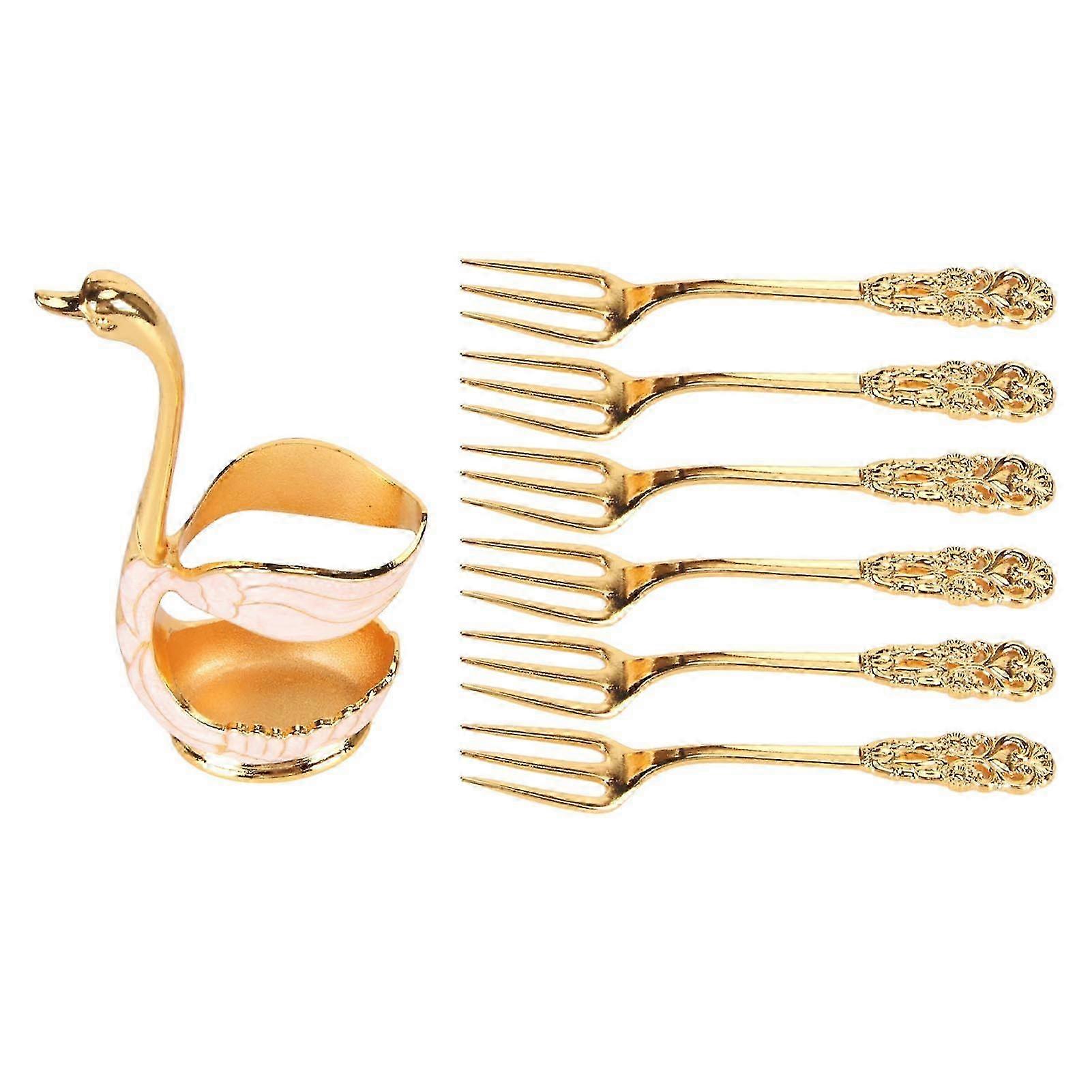 6Pcs Coffee Dessert Fork Set Metal Swan Base Holder Dessert Fork Organizer with 6pcs Forks for Coffee Fruit Dessert
