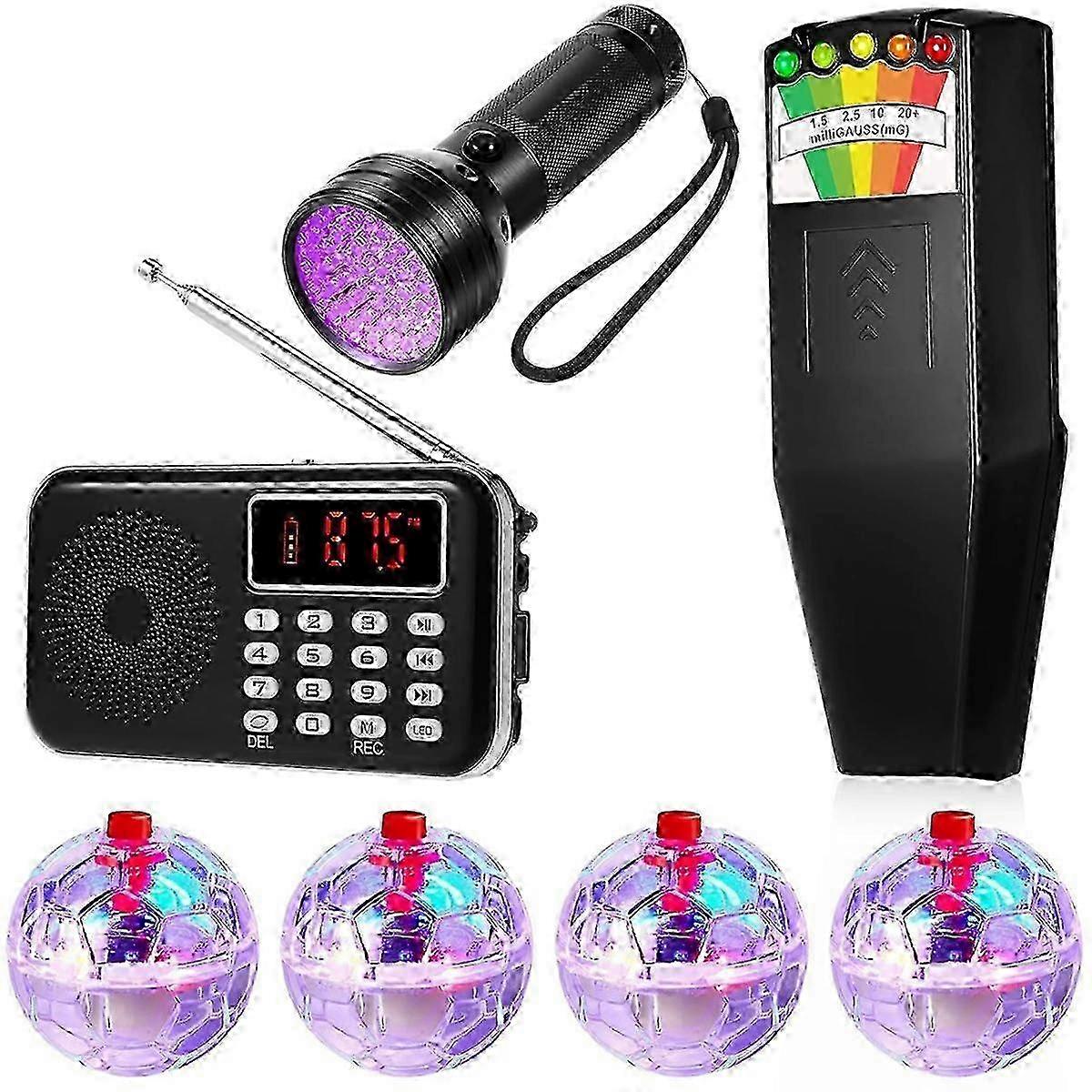 it includes 1 portable radio (battery included) and 1 EMF meter (battery included) 1 uv flashlight (no battery) and 4 LED light up pet cat ball (battery included) This comprehensive kit is specifically designed for detecting and countering phenomena, ensuring that even if you are just starting your journey, you have a user-friendly and reliable set of tools unveil the hidden electromagnetic radiations with our detector It can detect frequency ranges from 50Hz to 20000Hz, providing a wide spectrum for field detection With dual-use functionality, it measures both electric and magnetic fields simultaneously The visible five-light measurement values keep clued in on the magnetic field status at all times, even at night our ghost radio is , easy to carry, and has a high reception sensitivity When you get close to , the radio quickly respond and make a clear sound to remind you through our speaker, allowing you to communicate with The reception range of the radio is 87.5-108MHZ, it is fully functional, and it is equipped with an antenna our UV flashlight embedded with 51 UV LED lights offers a vast irradiation area Ideal for , outdoor adventures, and even house cleaning, it is a versatile tool , mineral findings, or pet urine stains effortlessly To set up, simply unscrew the bottom, remove the battery assembly, and install your batteries, batteries not included our equipment kit is straightforward and user-friendly The device caters to both beginners looking to dip their feet into the world of paranormal exploration and seasoned ghost hunters ready to make their next Color: As shown Material: MetalandPlastic Package Contents: 7pcs x Hunting Equipment Only the above package content, other products are not included. Note: Light reflection and different displays may cause the color of the item in the picture a little different from the real thing. The measurement allowed error i