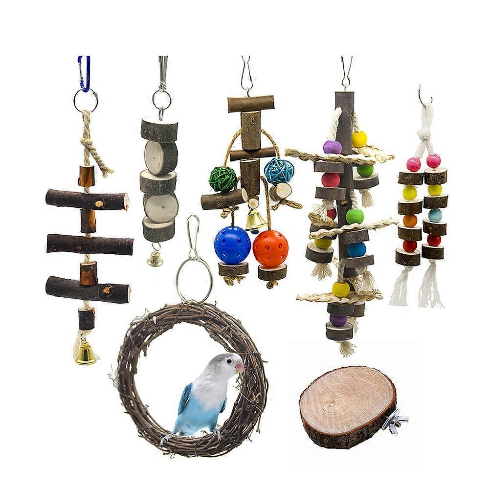 7pcs Funny Wooden Block Swing Toy Bird Parrot Playing Bite Toy Bird Cage Hanging Toy