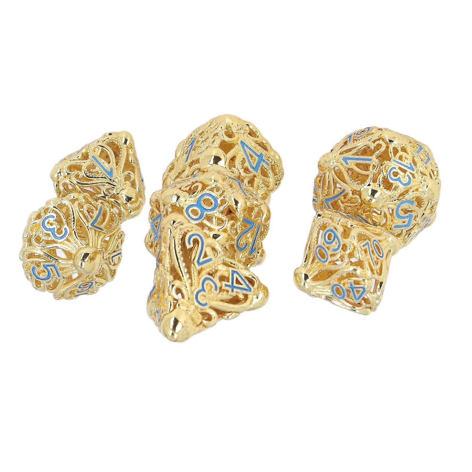 7pcs Metal Dice Set Hollow Golden Brass Polyhedral Exquisite Table Board Games Dice Set for Role Playing Games Blue Number