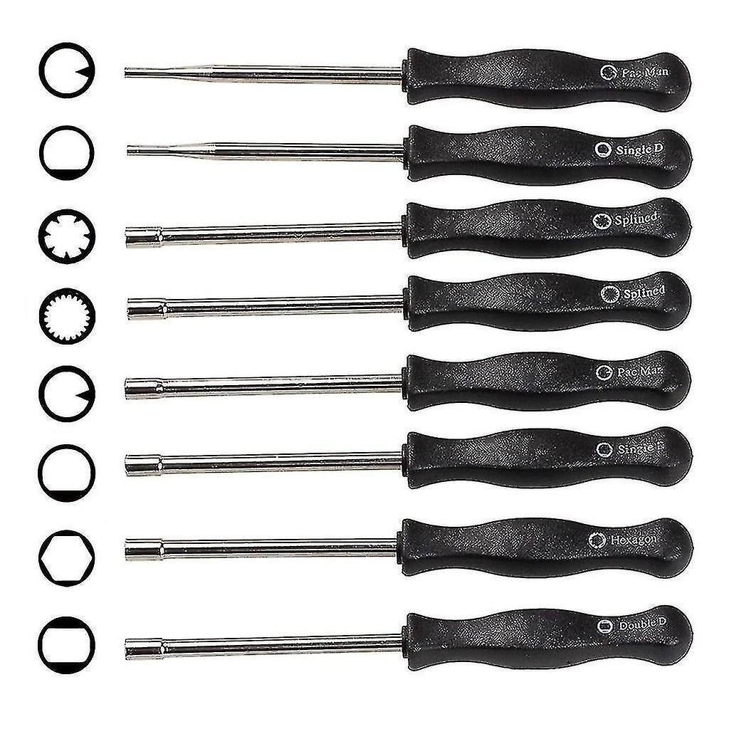 1) The most complete set of carburetor tools, including all tools to adjust and clean the 2-stroke carburetor engine 2) Fits kinds of brands 3) 8 carburetor adjustment screwdrivers including: Pac Man / Small Head Pac Man / Single D / Small Head Single D / Double D / Hex / 7 Teeth Serrated / 21 Point Screwdriver 4) Ergonomic design, slip resistance and square handle, stainless steel, more stability and precision 8-piece kit contains: 1 * Pac Man Screwdriver 1 * Small Head Pac Man Screwdriver 1 * Single D Screwdriver 1 * Small Head Single D Screwdriver 1 * Double D Screwdriver 1 * Hexagon Hex Socket Screwdriver 1 * 7-Teeth Splined Screwdriver 1 * 21-Teeth Splined Screwdrive Please note: Please clean the screws on carburetors before use, especially the small pipe adjustment tool