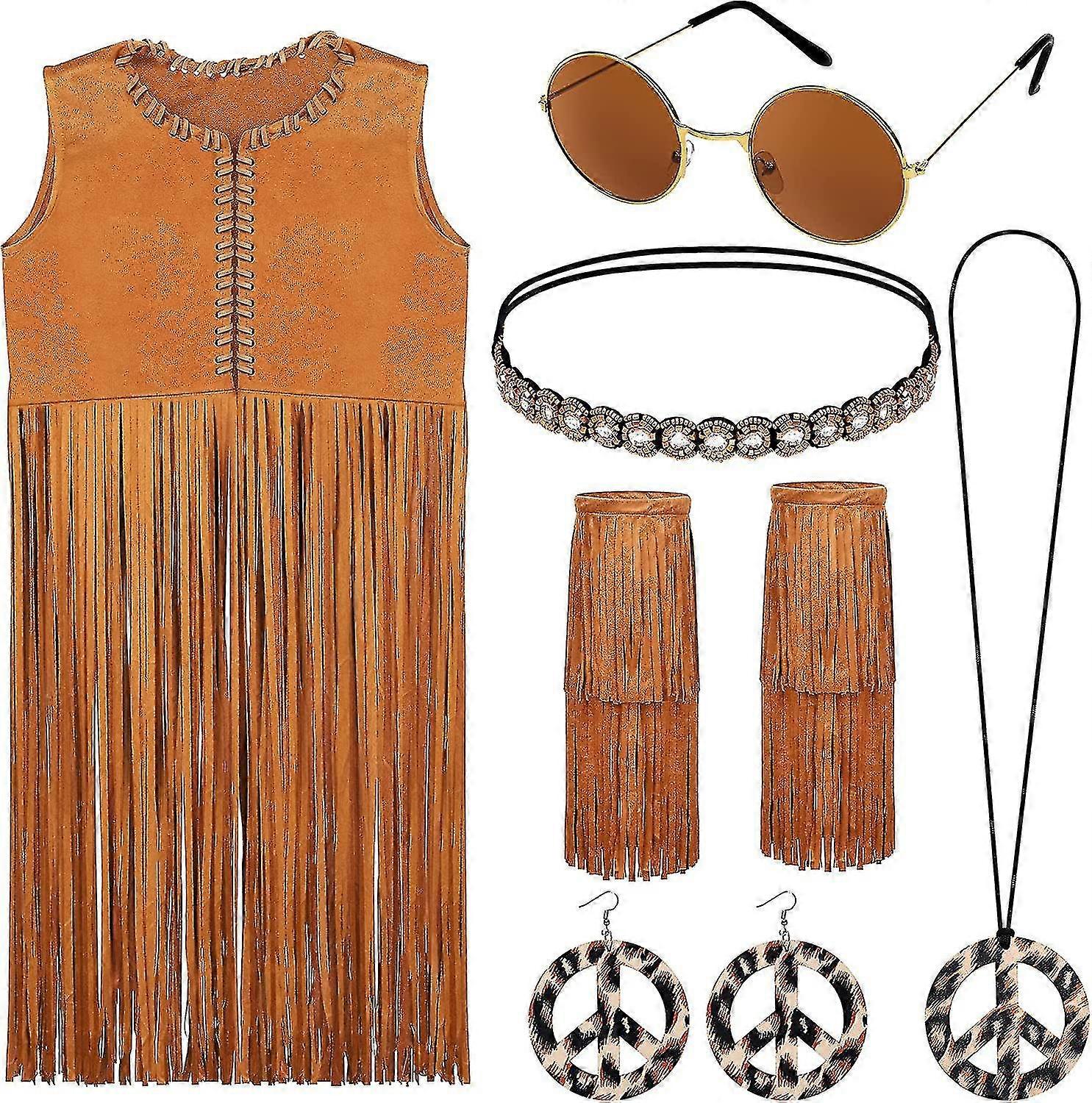 9 Pieces Women Hippy Costumes Set 60s 70s Women Fringe Hippie Vest Earring Necklace Headband Tassel Legs Set