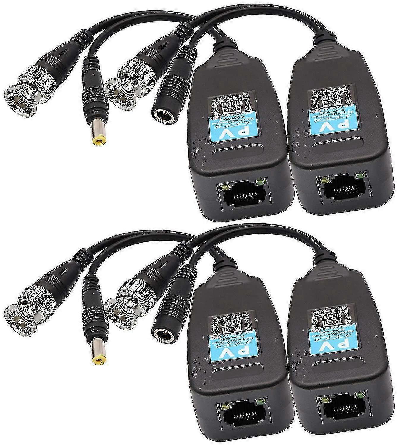 Quantity: (2 pairs) Size: Length7 inch or 19 cm) Material: (Plastic). The color: (Black) Connectors 1: RJ45 socket to BNC male or DC male, Connectors 2: RJ45 socket to BNC male or DC female. Compatible with CVI, TVI, CVBS and AHD video devices, suitable for 1080P 3MP 4MP 5MP 8MP CCTV cameras, monitor, DVR card and recorder etc. Easy installation, using standard UTP CAT5 cable system and power supply low voltage. The LED indicates (the green light) is working, the model (the yellow light) is not working. Video transmission via UTP CAT5. Note: Supply voltage drop calculations: For 12V DC 1Amp, cable distance should not exceed 90 feet or 27 meters. For longer distances please use 14V DC, 16V DC, 18V DC, 20-48V DC. Note: The RJ45 video balun is not waterproof. For indoor use only.Make sure the rj45 for camera side and DVR side are the same standards.Incorrect color mixing may cause camera and devices to burn out. Quantity: (2 pairs) Size: Length7 inch or 19 cm) Material: (plastic). Color: (black) Connectors 1: RJ45 to BNC male or DC male, Connectors 2: RJ45 to BNC male or DC female. Compatible with all HD-CVI, HD-TVI, HD-AHD. (CVI or AHD or TVI) Maximum distance length: (1080P 3MP 4MP 5MP 8MP: 200m or 656ft) (720P 960P: 250m or 820ft) (CVBS or Analog) Max Distance Length: (960H: 300m or 1000ft) If these baluns are used outdoors without shelter, please wrap them with waterproof tape after connecting them to your cameras.
