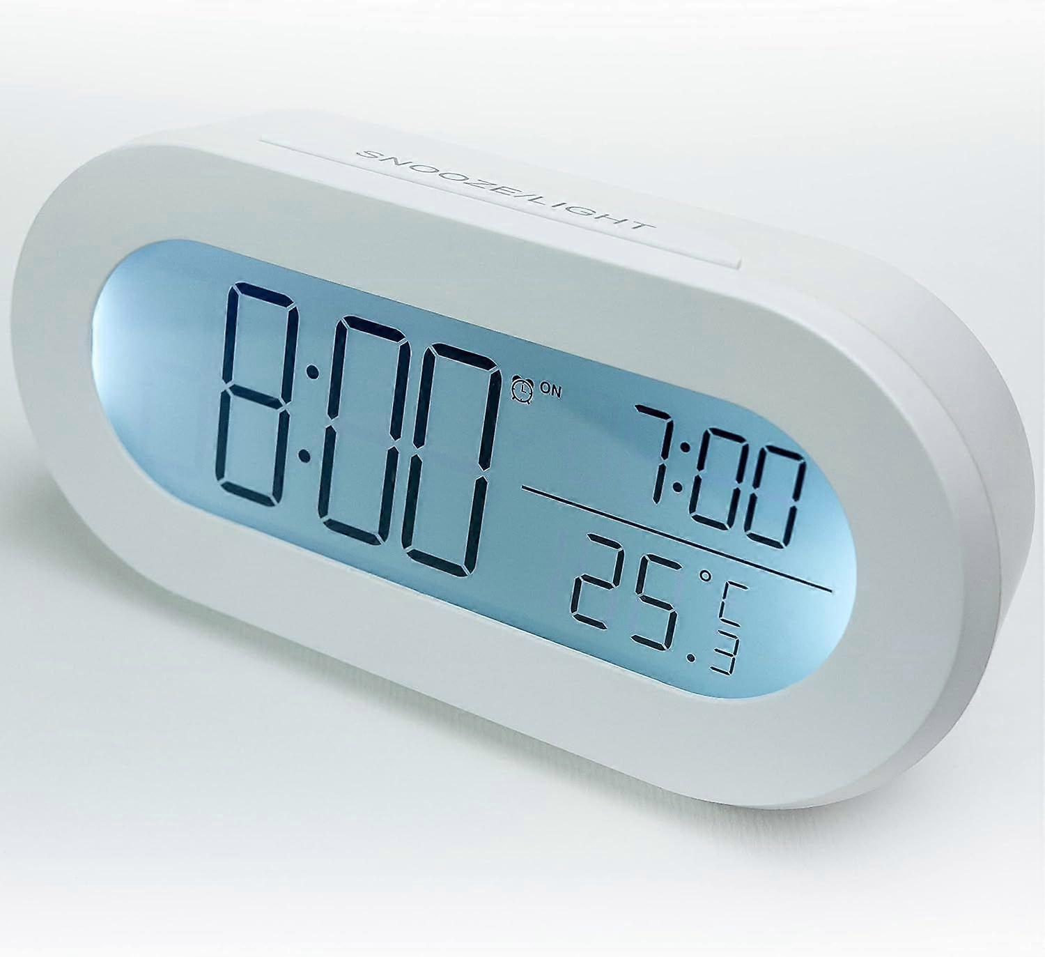 Digital Alarm Clock, For Bedroom, Office and Travel. Compact Styled Design. Large clear LCD Shows Time, Alarm, Room Temp. One Touch Snooze and Back Li